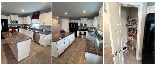 The gorgeous, oversized kitchen is truly the heart of the home, featuring granite countertops, stylish white cabinetry, a large center island with additional storage, pantry space, luxury plank flooring, and a window overlooking the backyard. Whether preparing everyday meals or entertaining guests, this kitchen delivers both beauty and practicality.
